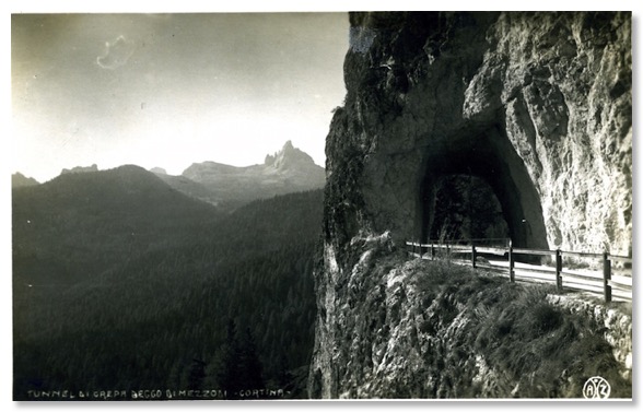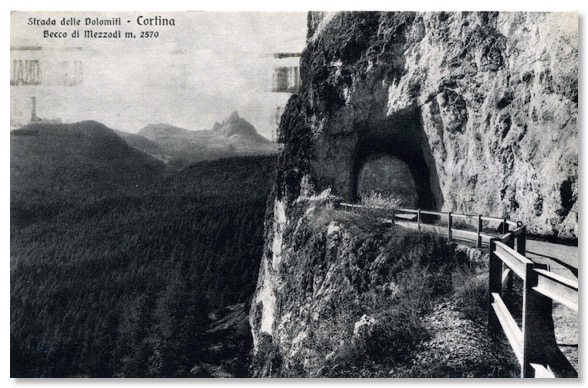I seem to have a wider photo of it than Zardini, but it is a view very little different today, save for the stout roadside wall that has replaced the fence. There is a serious drop to its right!. Cortina has grown a lot, too. By 1956, Cortina was already large and prosperous enough to host the Winter Olympic Games, and its growth continues.
